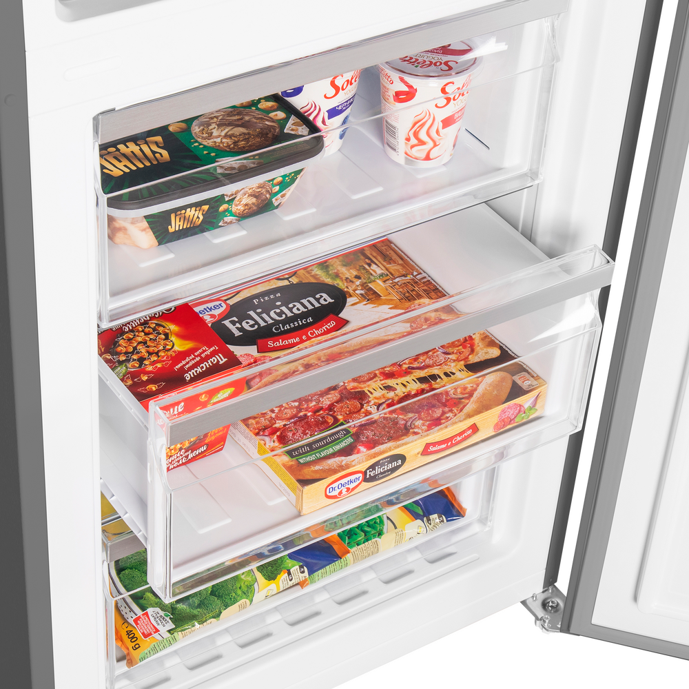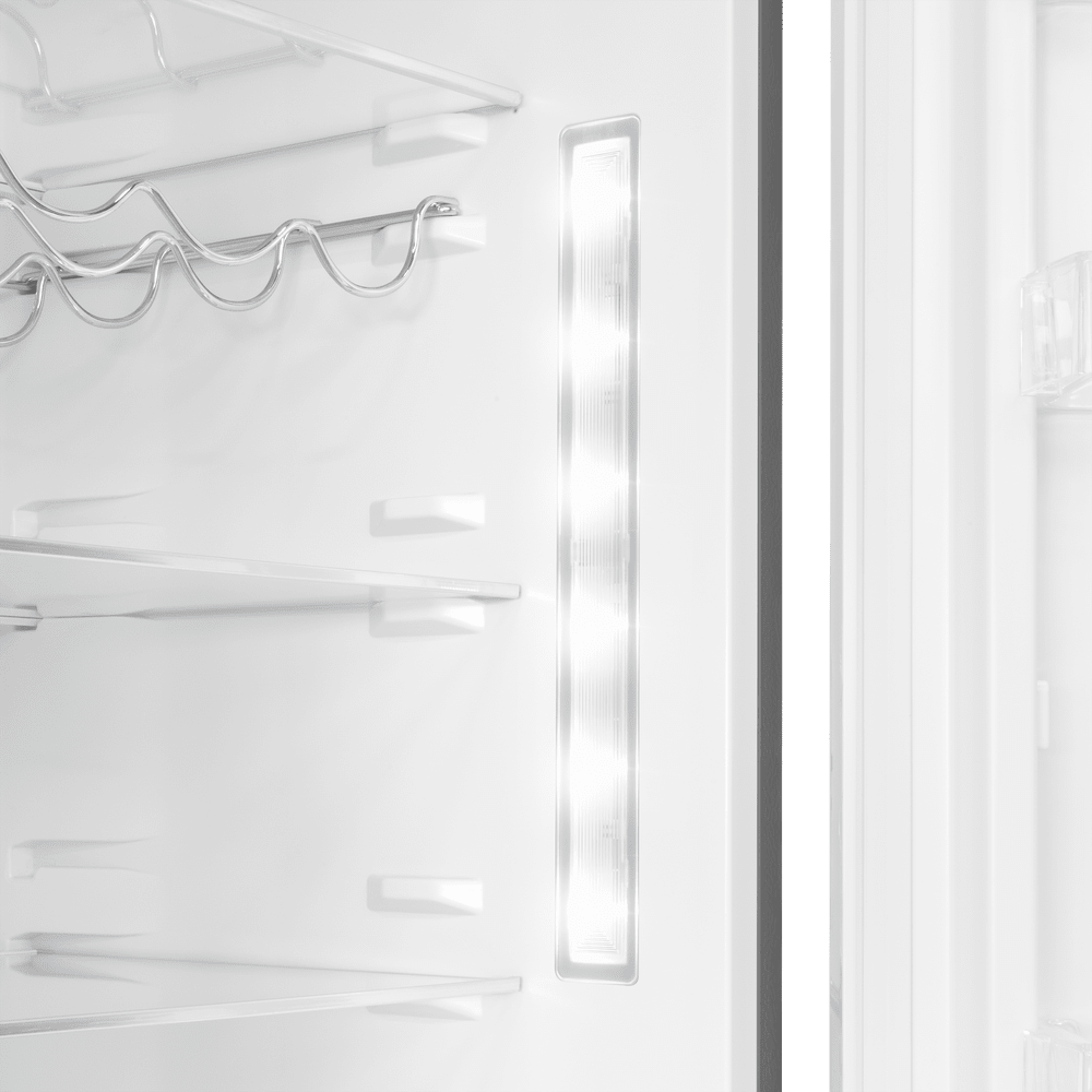 Внутреннее пространство легко адаптировать под ваши задачи: регулируемые полки, стойка для бутылок и гладкие поверхности помогают быстро навести порядок и поддерживать чистоту. При этом полезный объём 351 л позволяет комфортно разместить семейные запасы без компромиссов.