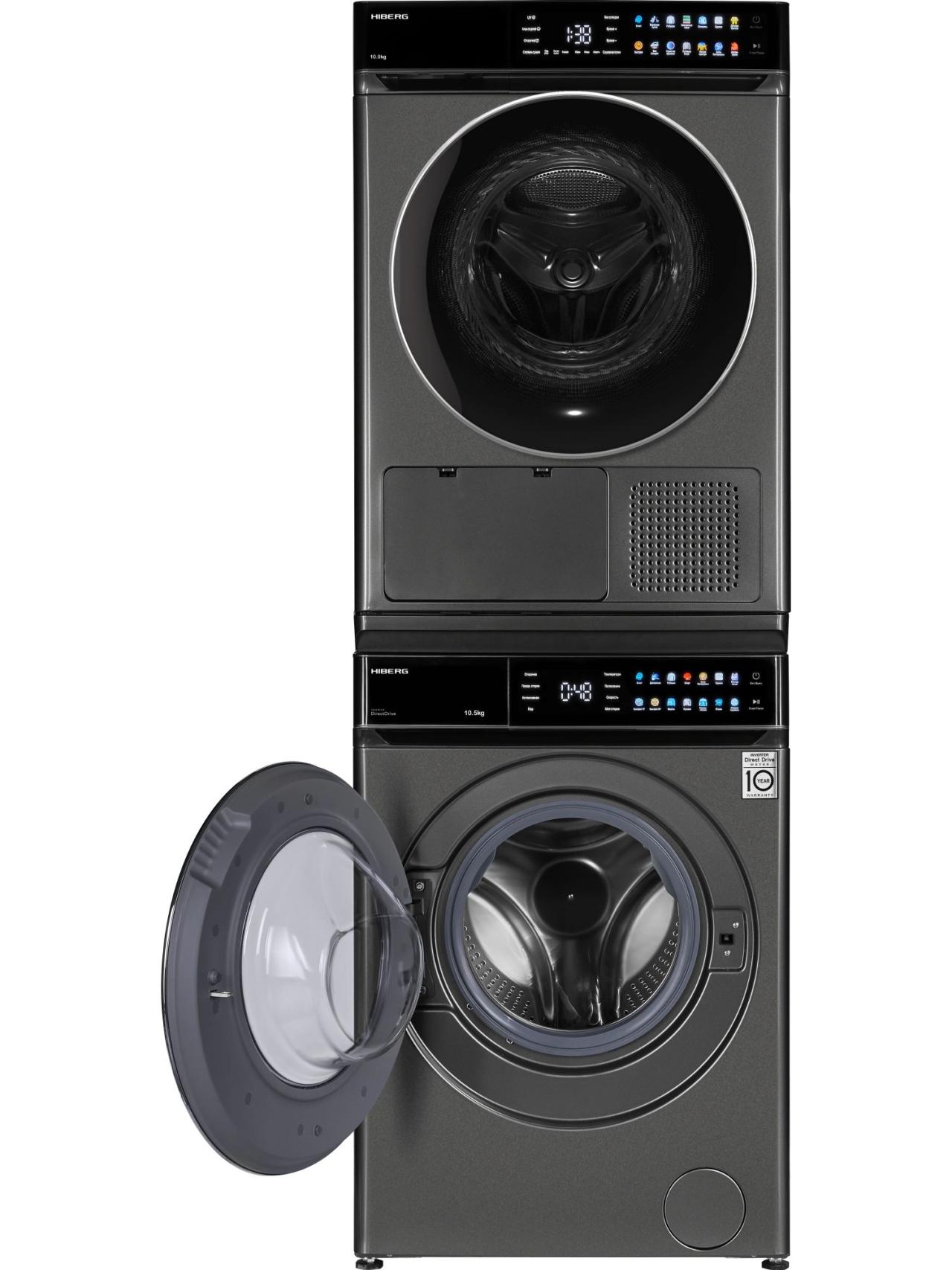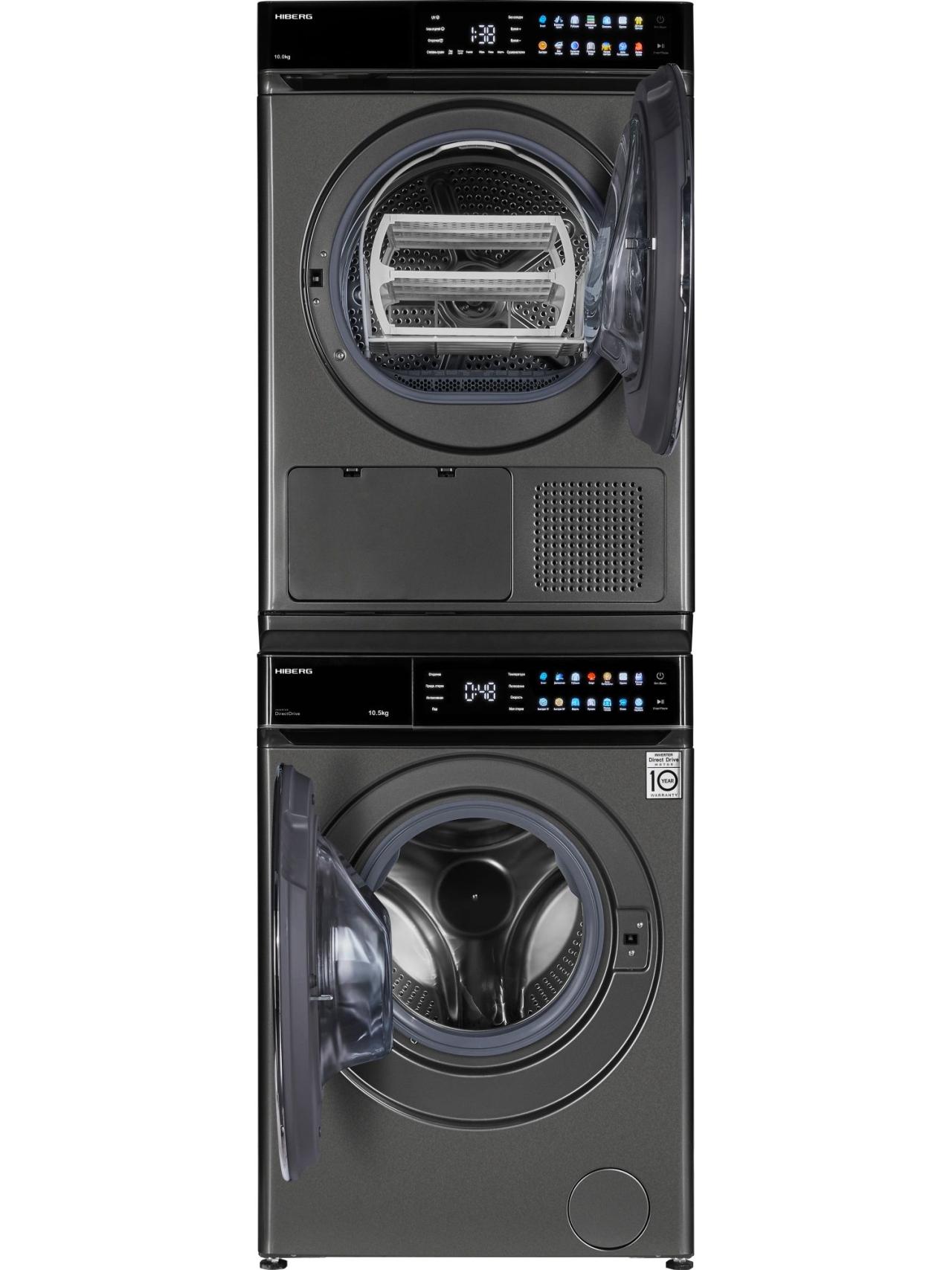 Комбинация «Сушильная машина HIBERG HDQ11 10 Sd + Стиральная машина HIBERG i-DDQ11 1014 Sd + соединительный элемент» от бренда HIBERG — удобное решение для семей, которым важно экономить место и время. Колонна устанавливается компактно и позволяет запускать два цикла одновременно, сохраняя единый стиль в темно-сером цвете.