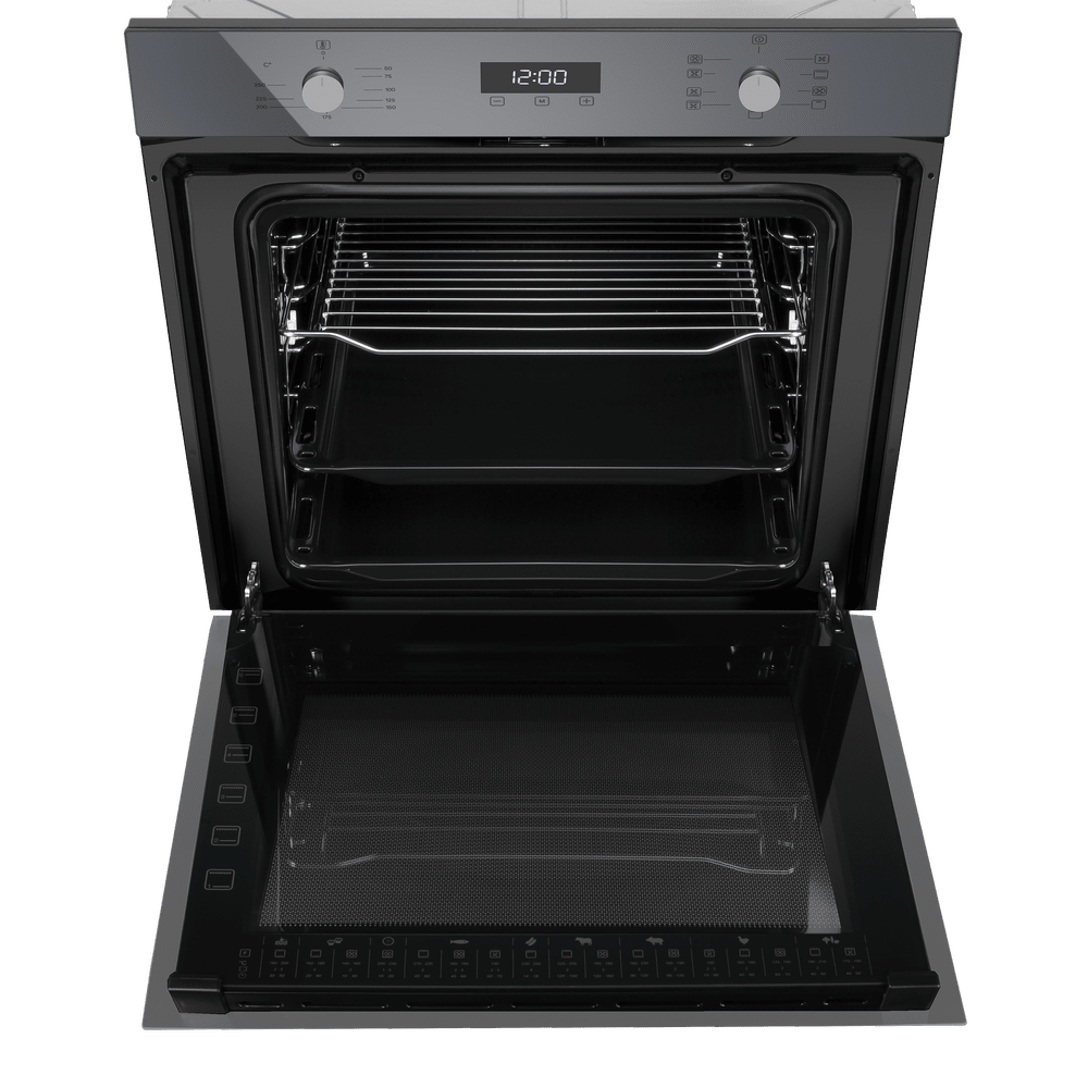 Внутри — черная эмаль легкой очистки, которая облегчает уход после запекания. Оснащение продумано для ежедневного комфорта: яркая подсветка, электрический гриль, конвекция и два уровня телескопических направляющих, чтобы безопасно выдвигать противни без риска проливов.