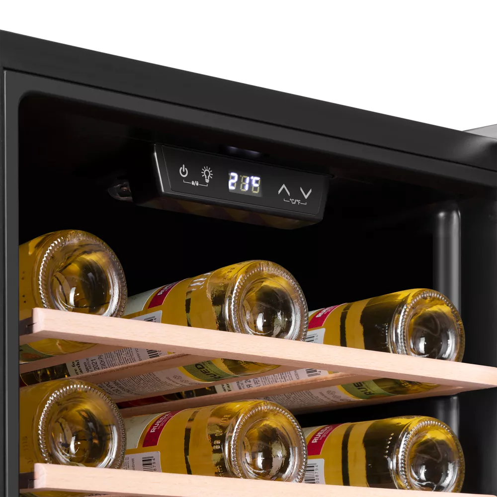 Шкаф вмещает до 56 бутылок и поддерживает температурный диапазон от +5 до +20 °C, что позволяет хранить красные, белые и игристые вина в оптимальных условиях. Такой режим способствует не только сохранности напитков, но и их дозреванию, раскрытию вкуса и аромата.